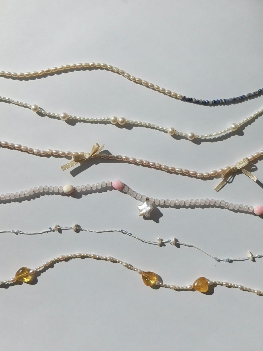 ガラスビーズのオリジナルリボンチャームがワンポイントの、淡水ホワイトパールの14kgfネックレス。 チャーミングなリボンチャームと、エレガントなベビーパールがロマンティックさを演出。 ドットからインスパイアされたリボンチャームは取り外しが可能で、シンプルなパールネックレスとしてもご使用いただけます。 あなたの気分やシーンに合わせて好きな使い方ができる、便利なアイテムです。 ※チャーム部分は一つひとつ手作業で製作しているので、多少の誤差が生じてしまう可能性があることをご了承ください。 ▽ご希望する長さがございましたら、購入オプションからご希望のサイズをお選びください。 [ 長さを選択 ] 36cm ¥0 40cm ¥0 50cm ¥500 _______________________________ < 素材 > 14kgf金具 真鍮/GP金具 淡水パール ガラスビーズ 【 14kgf 】 14金ゴールドフィルドは合金を芯として、表面に総重量の5%以上の14金をコーティングした素材です。 < サイズ > モデル約36cm着用 淡水パール約2mm-3mm リボンチャーム約30mm < ご購入の際の注意点 > https://adamasjewel.base.shop/p/00001 _______________________________ Product Info 14kgf pearl necklace with beaded bow ties charm. Handmade to order. 【 Materials 】14kgf parts, gold plated parts, glass beads, and freshwater pearls 【 Length 】36 cm, 40 cm, or 50 cm | 14 - 19 in 【 Product Care 】https://adamasjewel.base.shop/p/00004
