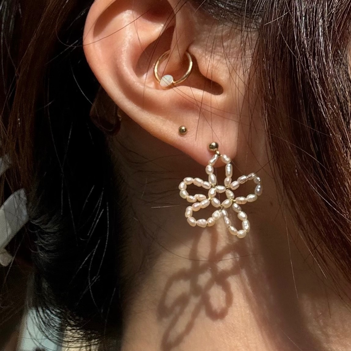 ベビーパールのフラワーピアスはカジュアルにも綺麗めにも使えます🌼