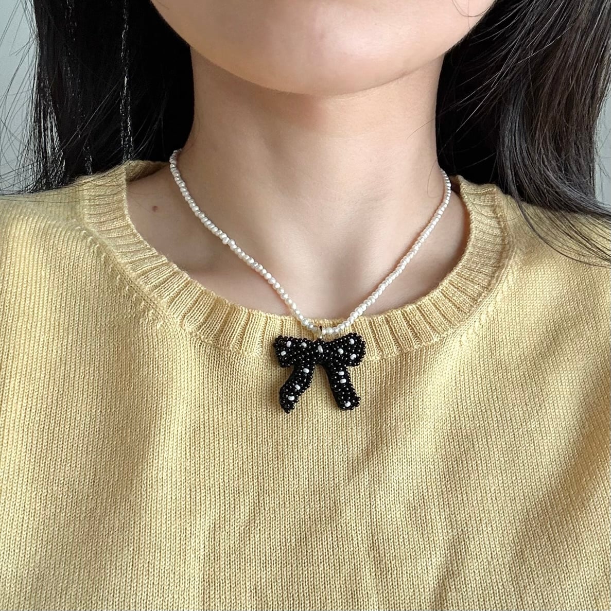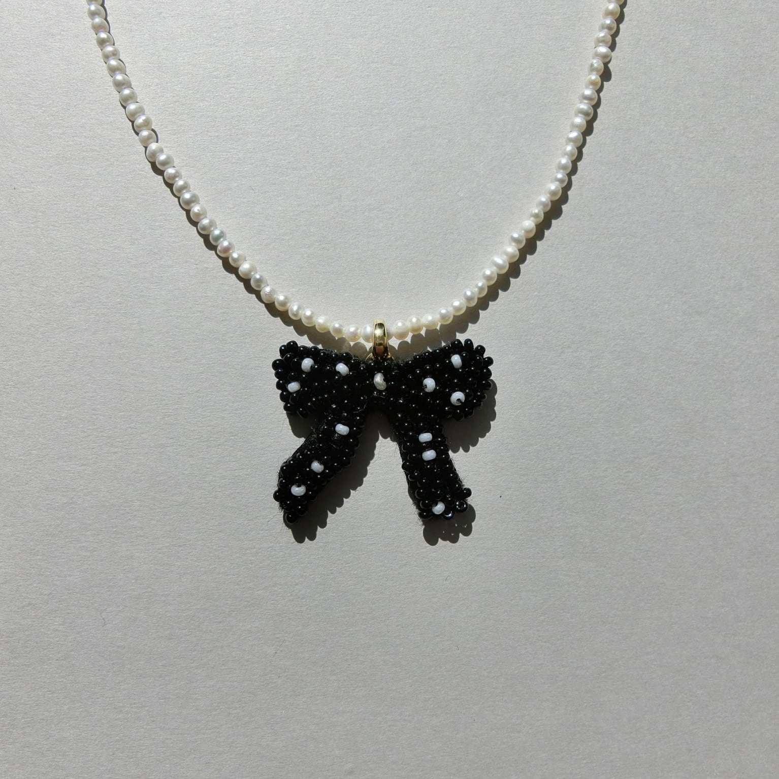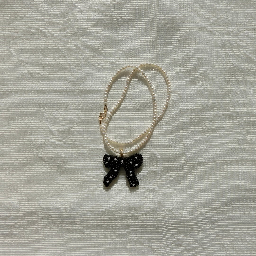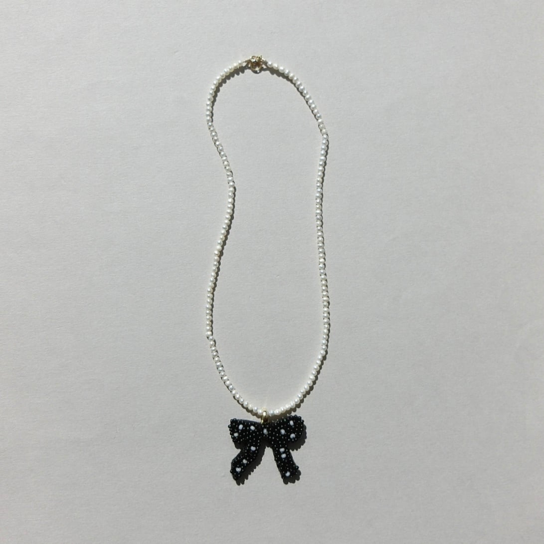 ドットからインスパイアされたリボンチャームは取り外しが可能で、シンプルなパールネックレスとしてもご使用いただけます。