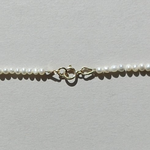 ガラスビーズのオリジナルリボンチャームがワンポイントの、淡水ホワイトパールの14kgfネックレス。