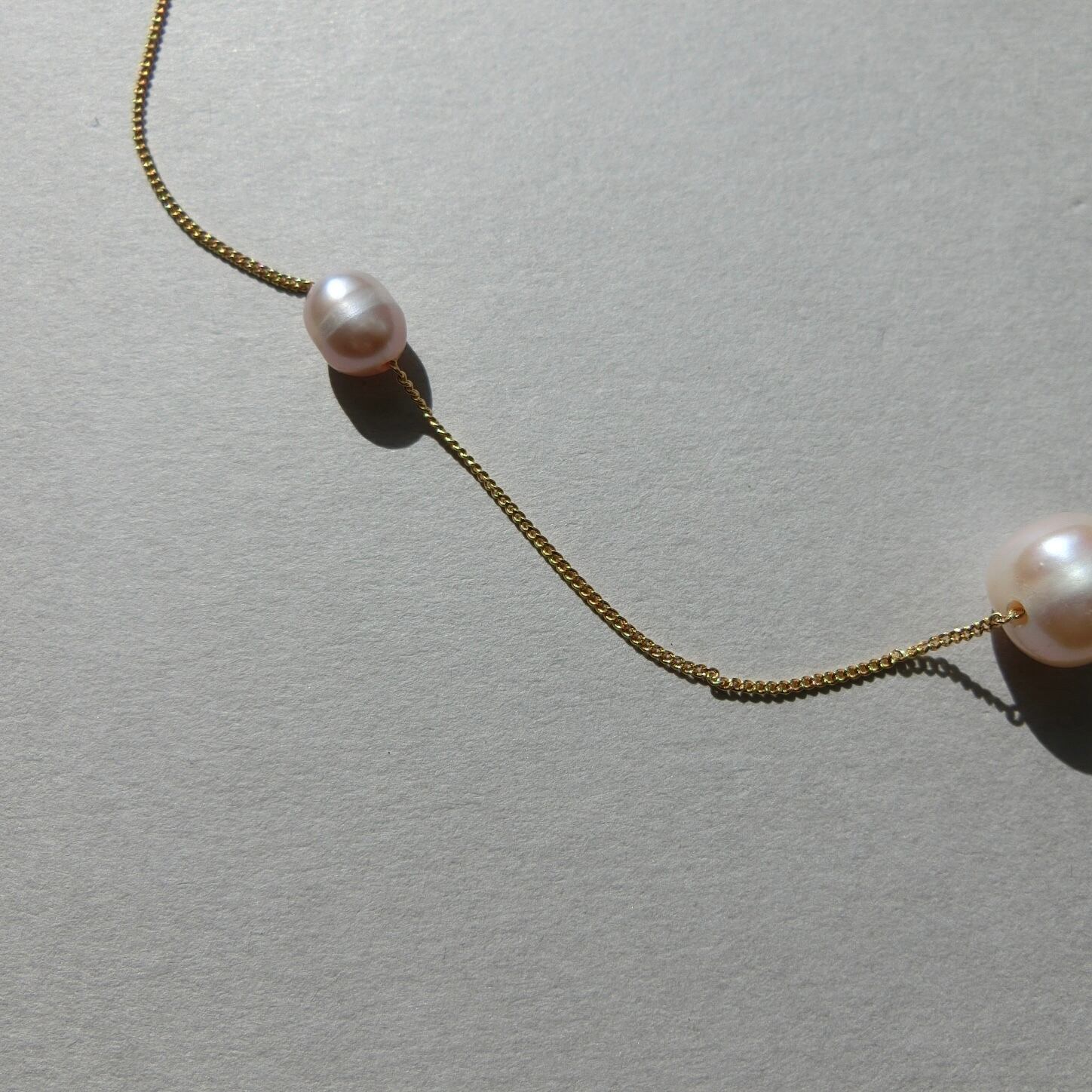 柔らかなピンクカラーの淡水パールが、首元に優しく寄り添う華奢ネックレスです。