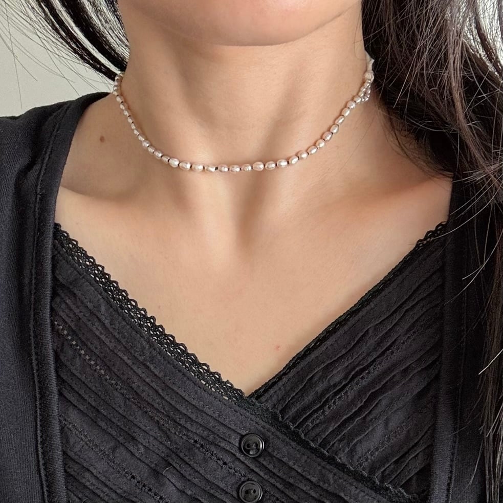 中央部分は淡水パールを、ブラックシルクコードで一粒一粒結び目をつけ、首に寄り添うしなやかさを実現。
