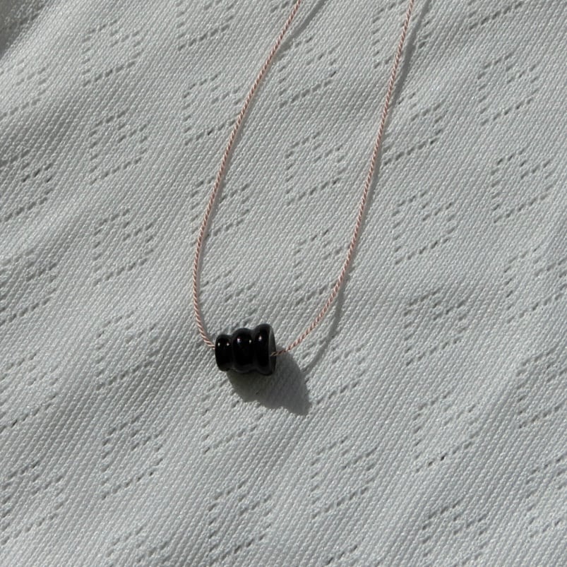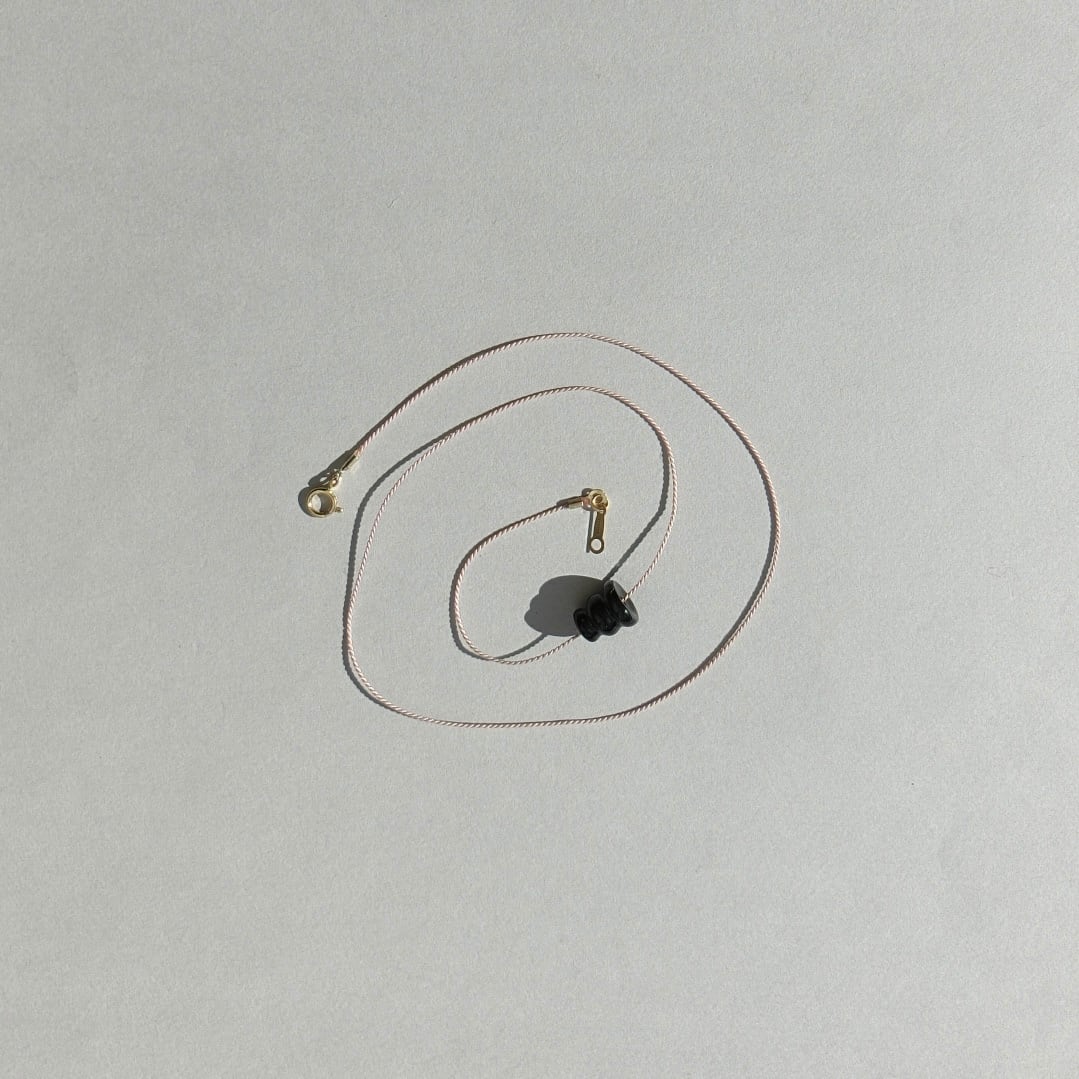 モードな雰囲気に、メリーゴーランドのような螺旋形のユニークなビンテージ黒ビーズが、アーティスティックな要素をプラス。
