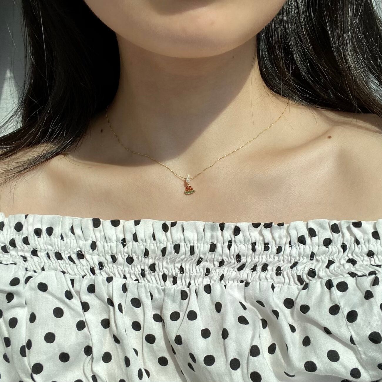 小ぶりなフルーツチャーム x 華奢チェーン x ベビーパールの可愛い三拍子のネックレス。