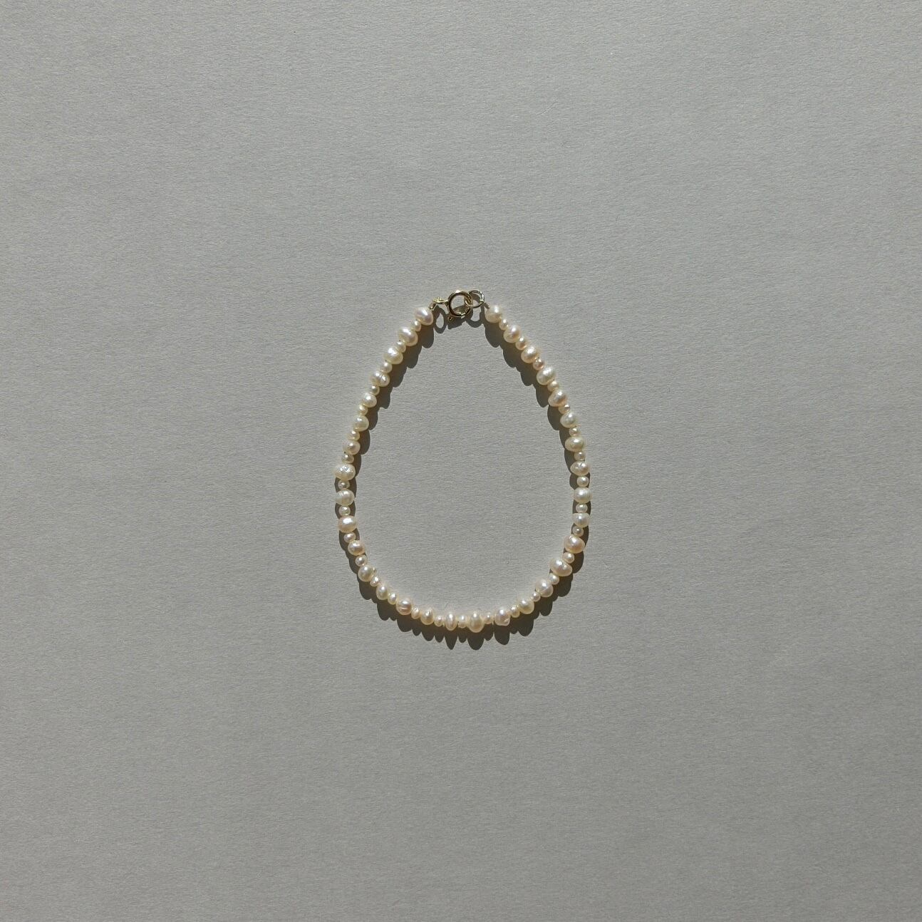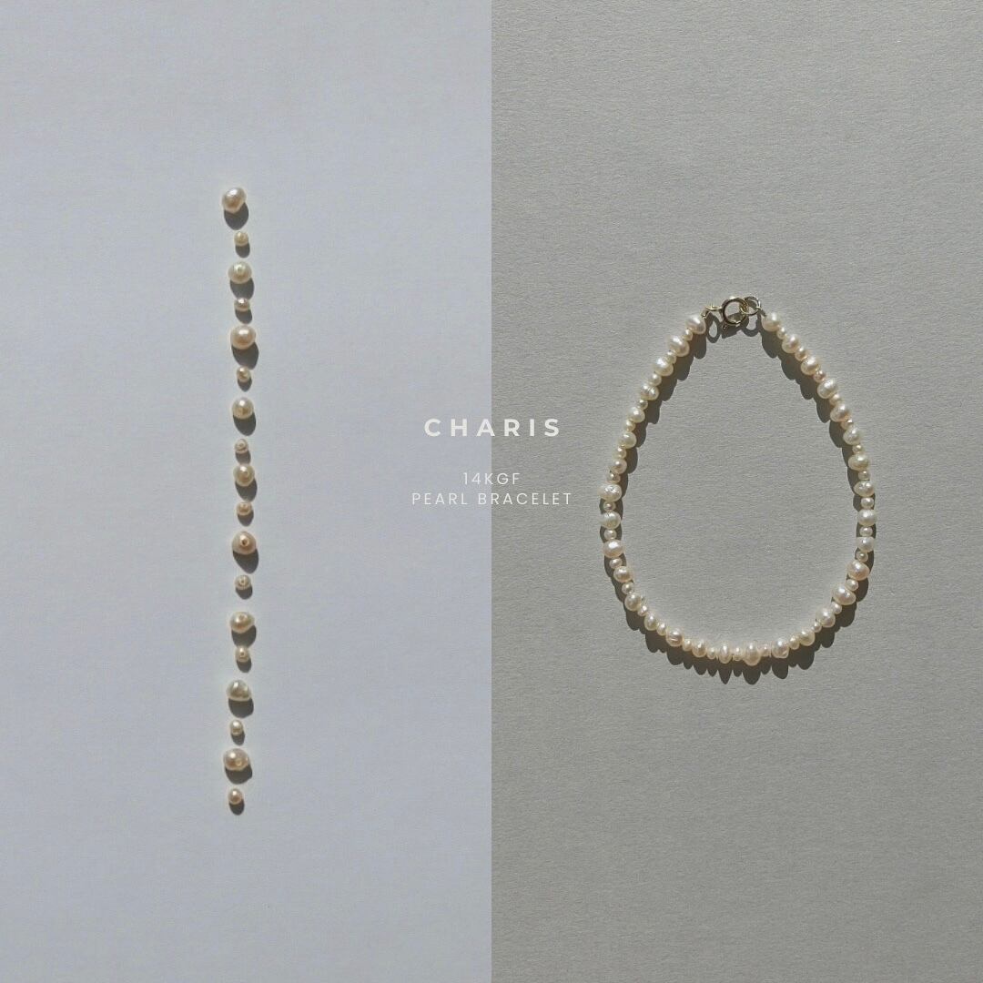 異なった大小2サイズの淡水ボタンパールを使用した、コントラストが美しい14kgfブレスレット。
