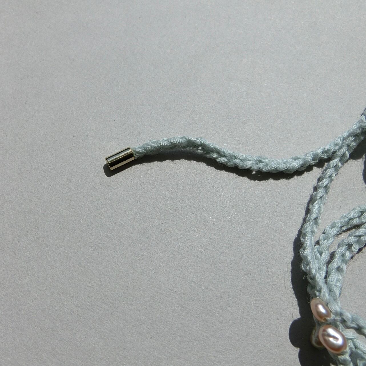 コードの色はベビーブルーとホフホワイトの2色をご用意しており、淡いカラーリングにぴったりなソフトピンクの淡水パールを散りばめて、まろやかな色彩にまとめました。