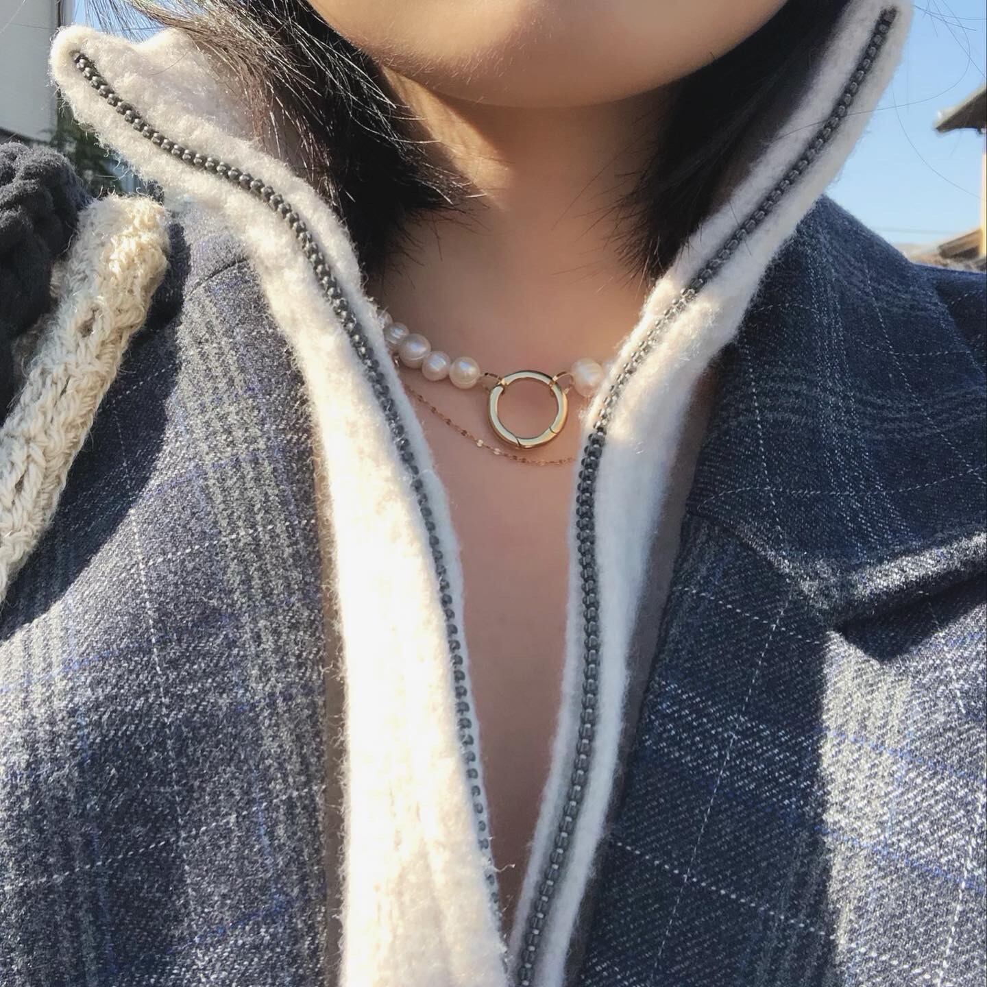 カラビナを後ろに持っていくことで、気分転換にシンプルなパールネックレスとしてもお使いいただける、マルチで便利なネックレスです。