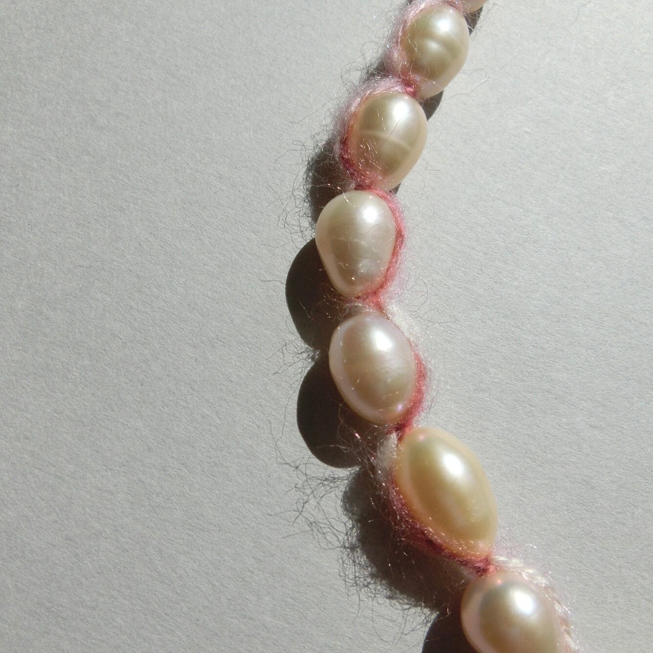 大粒の淡水スモーキーピンクパールに、グラデーションピンクモヘアを巻きつけた存在感あるパールネックレス。