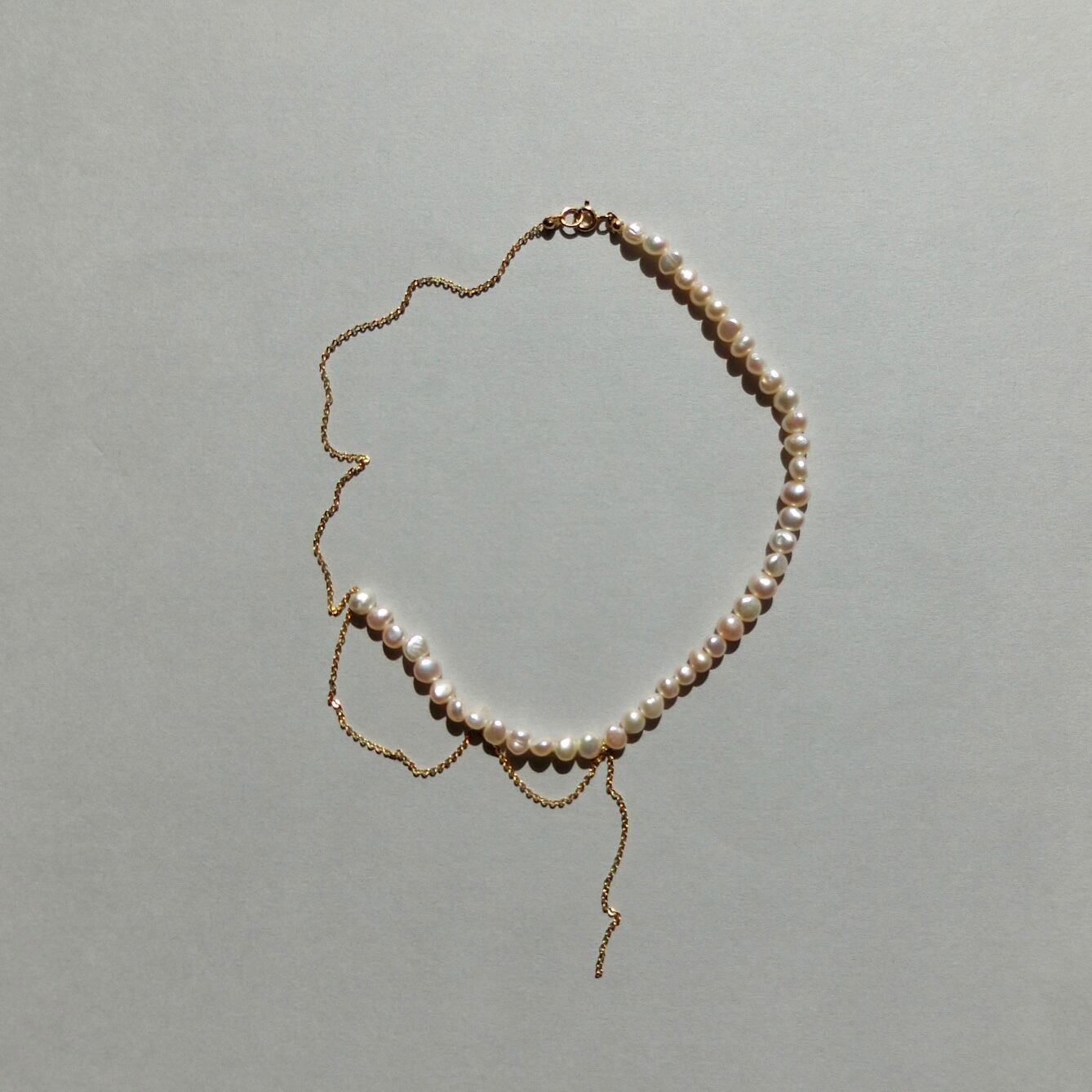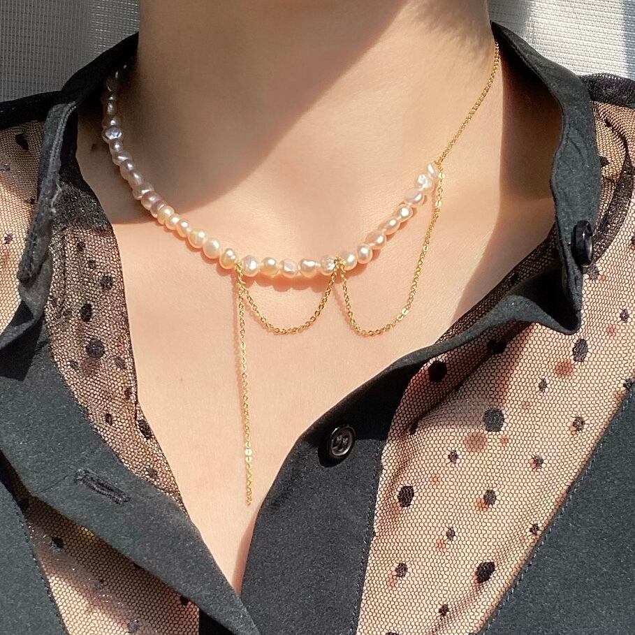 ミニバロックパールにチェーンをミックスさせた甘辛パールネックレス。