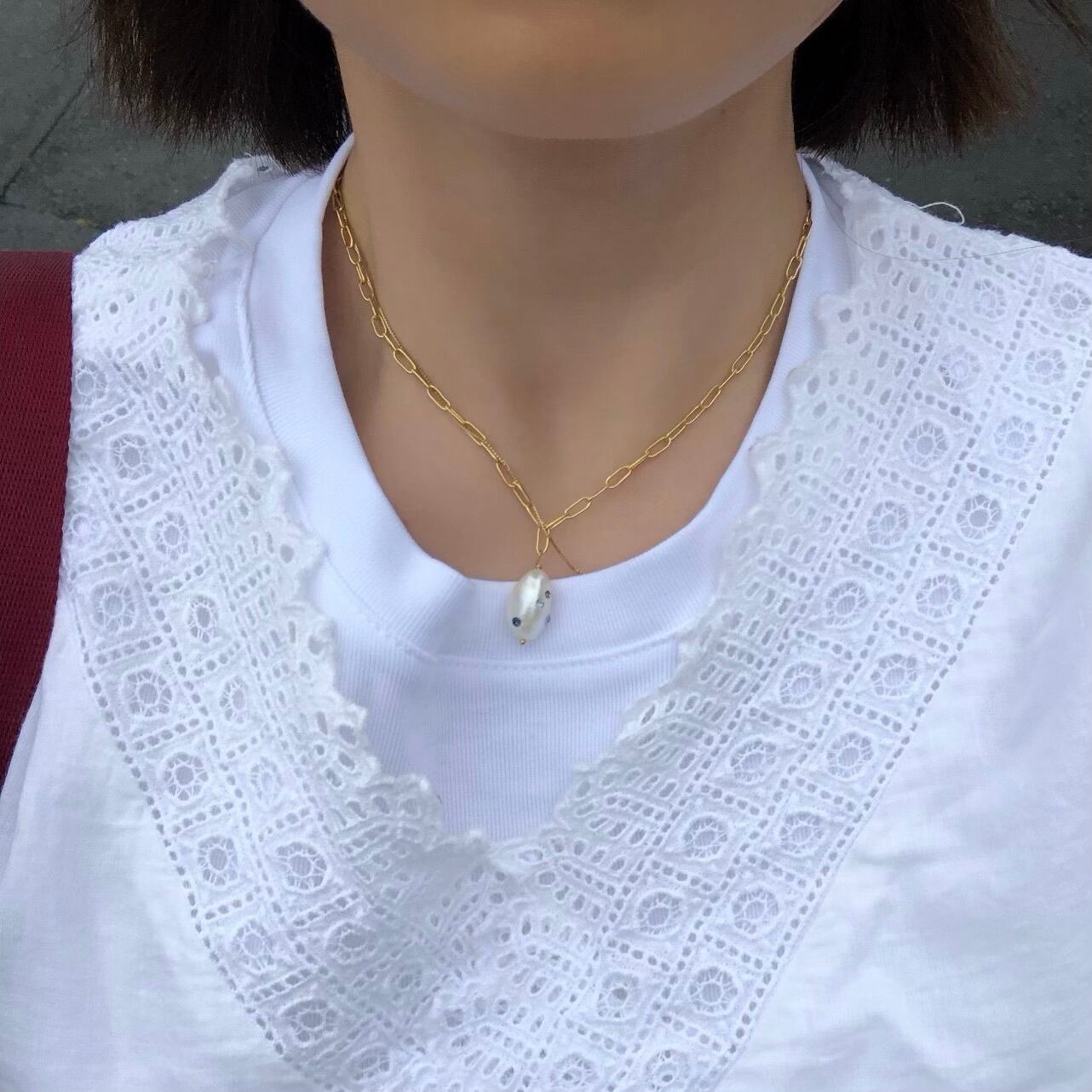 ブルーメインのクリスタルを埋め込んだ、淡水ドロップ型ホワイトパールが主役のチェーンネックレス。