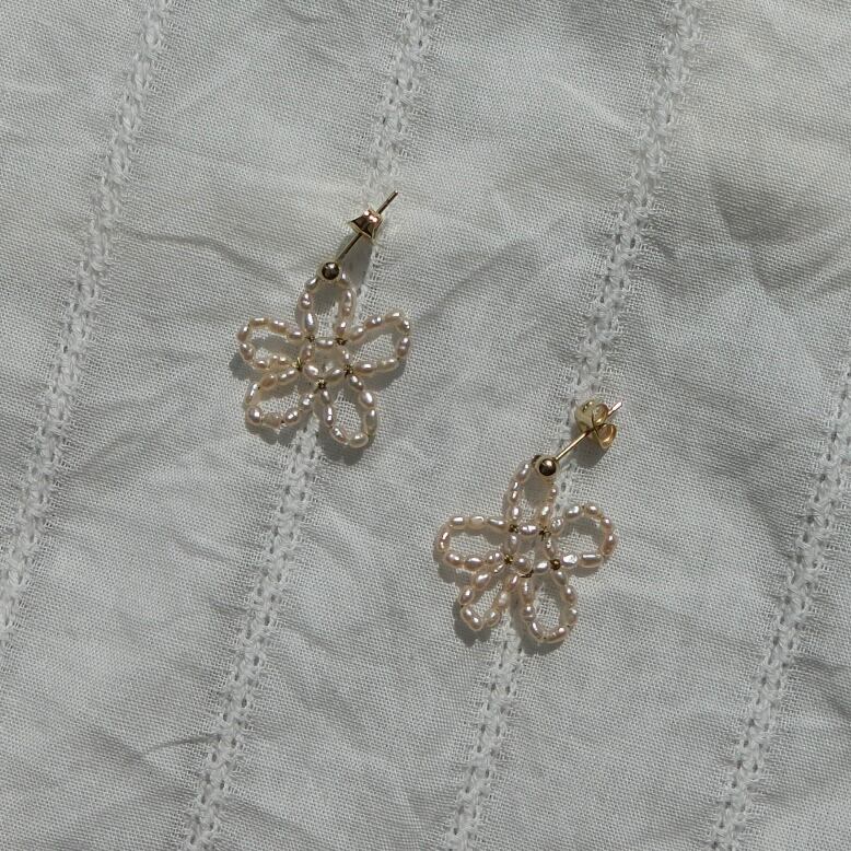 ハチの生活に欠かせないお花が着想源の、華奢でかわいいベビーパールでデザインしたフラワーピアス。