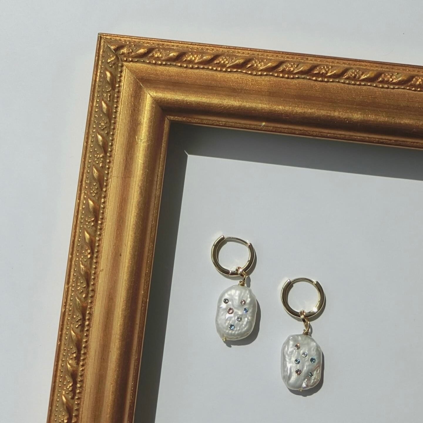 ピンク、ブルー、ホワイトの彩り豊かなカラーリングのクリスタルを、レクタングル型淡水パールに散りばめたフープピアス。