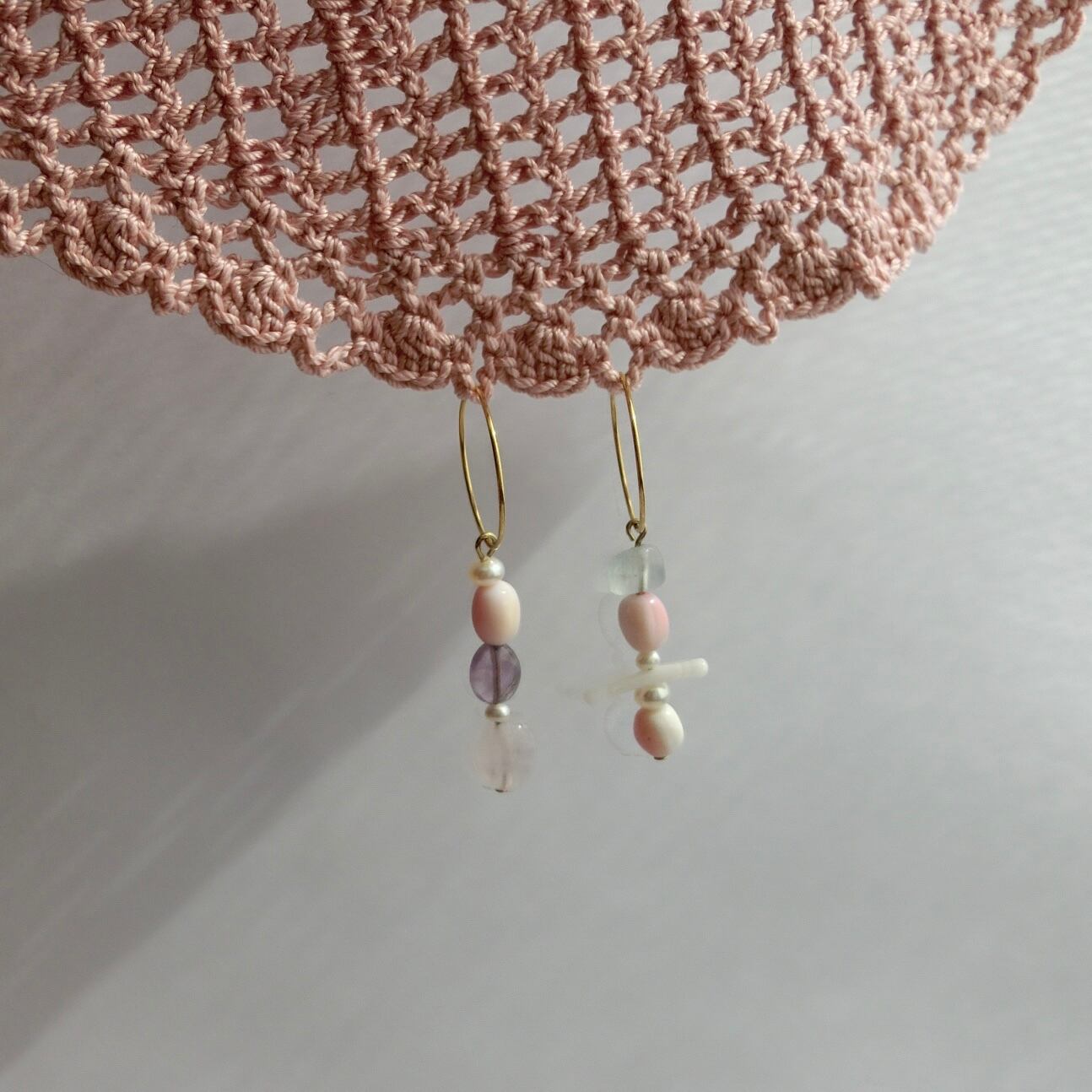 クイーンコンクシェル、ローズクオーツ、アメジスト、アクアマリン、ホワイトコーラル、淡水パールのチャーミングなロングフープピアス。